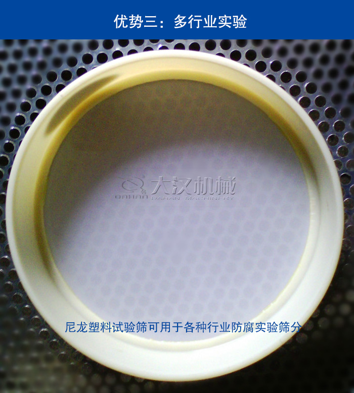 大漢機械生產的尼龍塑料試驗篩全部采用PVC材質,不含金屬成分,優(yōu)質的塑料框加上國家標準的防腐蝕尼龍網(wǎng),為您隔斷一切產生腐蝕的可能性。在需要防腐的實驗篩分工作中您都可以選擇尼龍塑料試驗篩。