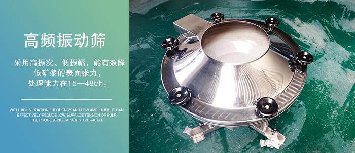 高頻振動(dòng)篩采用高振次、低振幅,能有效降低礦漿的表面張力,有利于細(xì)、重物料的析離分層而加快細(xì)、重物料透篩入料濃度在30%—40%,處理能力在15—48t/h。