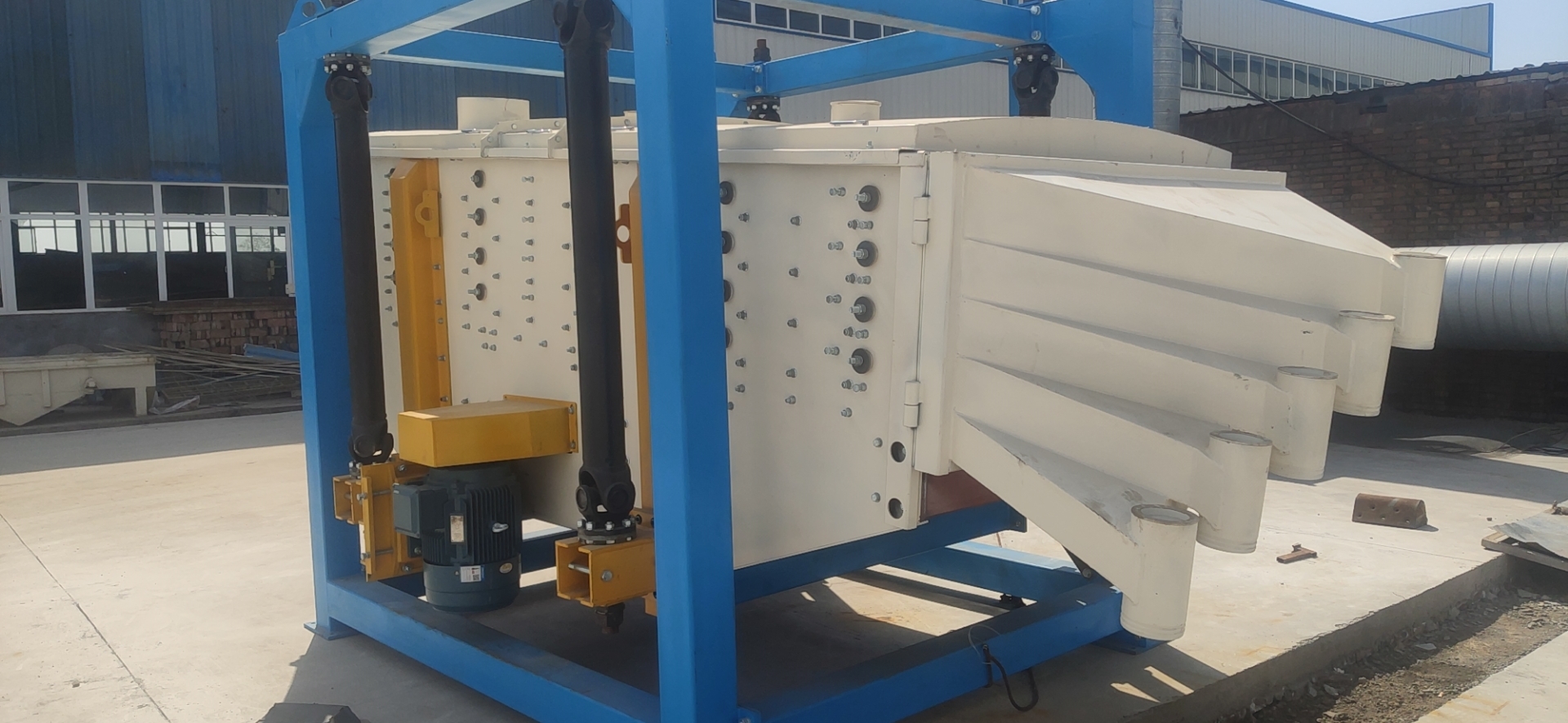 方型搖擺篩利用四根萬向傳動軸把箱體掛在外框架上,通過和變速器、電機的配合,讓箱體進行平面回旋的篩分運動,不僅穩(wěn)固,而且美觀大方;