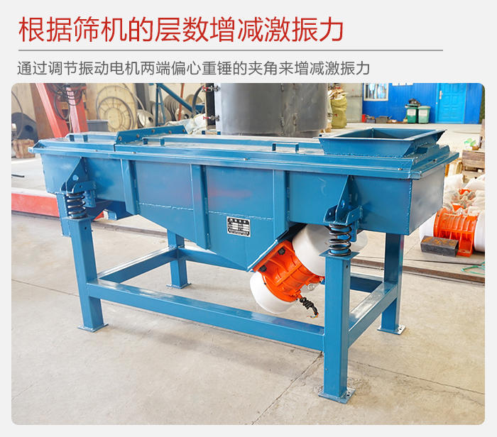 5、用戶可根據(jù)篩機(jī)的層數(shù),物料比重不同來(lái)增減篩機(jī)的激振力(通過(guò)調(diào)節(jié)振動(dòng)電機(jī)兩端偏心重錘的夾角來(lái)增減激振力),使篩機(jī)達(dá)到最佳的篩分效果。